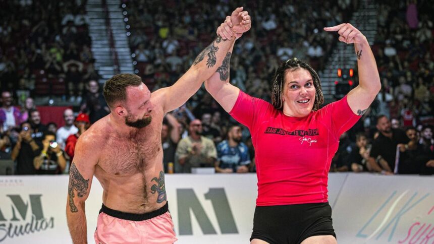 The Australian grappler dominated his 6’2″ opponent from the opening bell … though she drew out the fight a little before finally tapping out in the second round of the intergender bout.