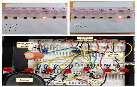 The system is meant to automate daily medication reminders with the help of both visual and audio alerts. It is noted that patients generally get irritated by noise intervention. To ensure that the Audio section (BT66/UM66 part, here) is not activated by erroneous signals, we have provided optical isolation using an opto-coupler IC. Every day, the reminder circuit lights up an LED (for 10 seconds in the present case) corresponding to the specific day of the week, and additionally, an audio indication is activated for a pre-decided duration (10 seconds, in the present case) for every gap of 24 hours. Once the alert is activated, the system goes back to calculate the next gap interval of the 24-hour cycle. For demonstration purposes, we have chosen 10 10-second (instead of 24-hour) interval and an alert duration of 1 sec (instead of 10 seconds) for ease of video recording.